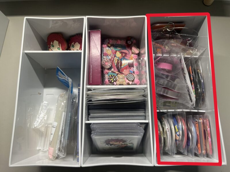※よりコンパクトな収納ケースに移し変え、赤枠箇所に缶バッチ、ころっと、キーホルダー系を全て収納。